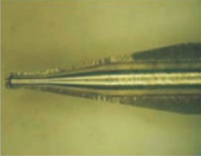 - 適用于點(diǎn)膠范圍較為狹窄的針頭,為了避免點(diǎn)膠時(shí)與 器件內(nèi)部碰撞,不改變針頭內(nèi)徑,將外徑縮小。一般 的針頭前端壁厚是50μm,細(xì)針頭最小可做到25μm, 能有效解決狹窄空間點(diǎn)膠難問題。